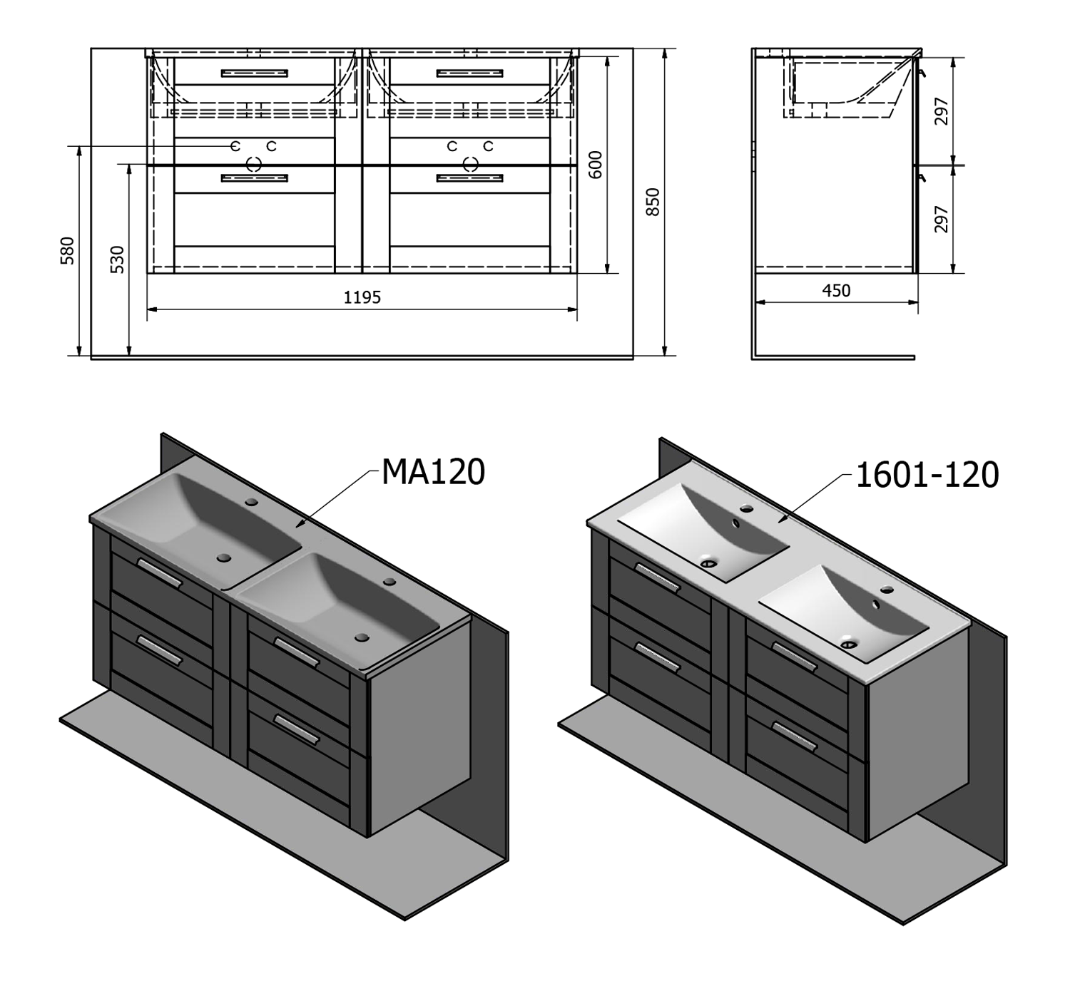 SLIM keramické dvojumyvadlo, nábytkové, 120x46,5cm, bílá 1601-120