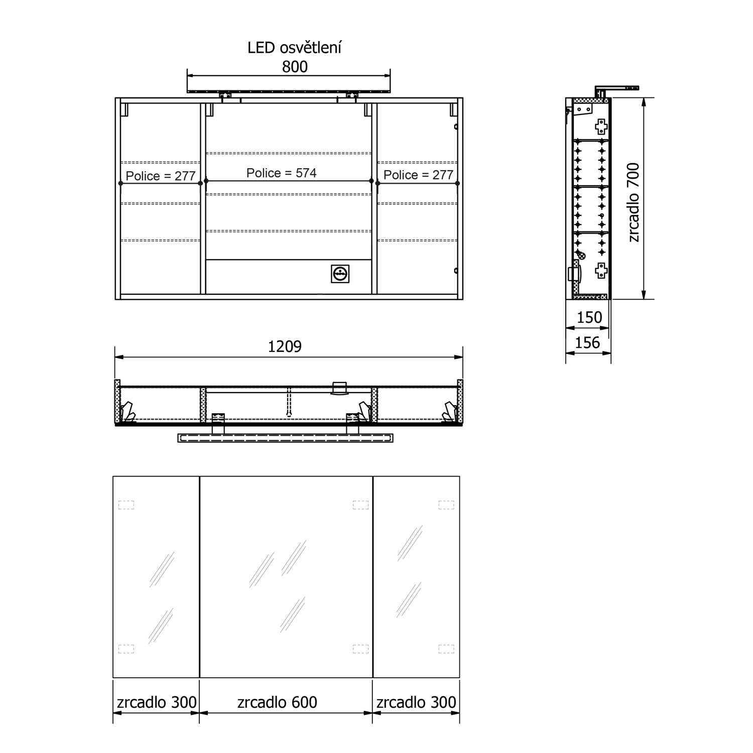 Osvětlení; Elektrická zásuvka; Oboustranná zrcadlová dvířka; Zpomalovací panty
