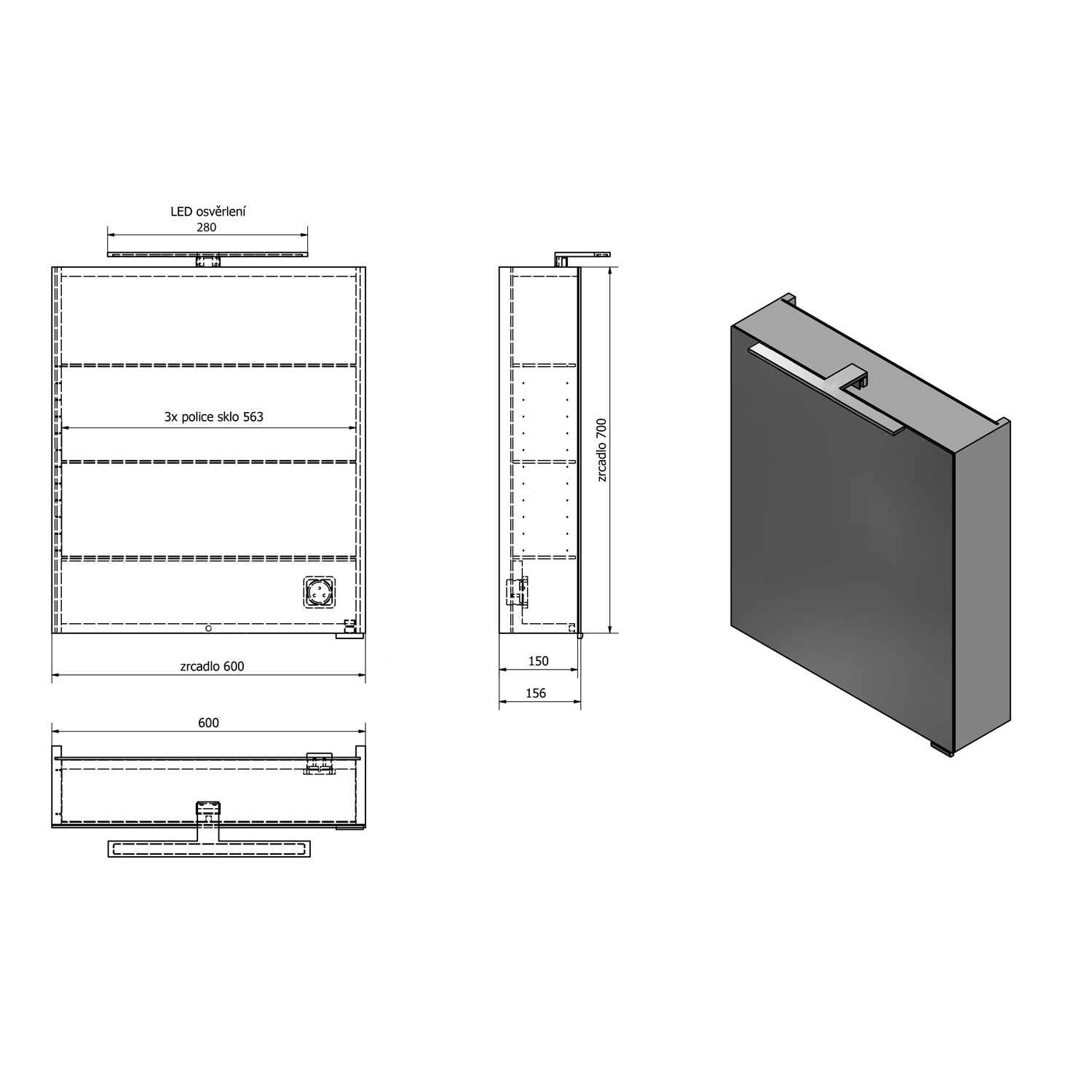 Osvětlení; Elektrická zásuvka; Oboustranná zrcadlová dvířka; Zpomalovací panty