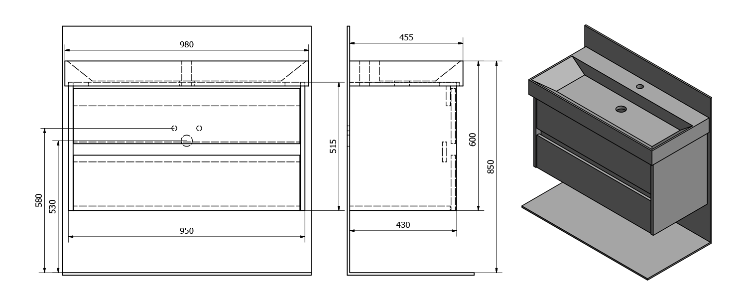 QUADRADO betonové umyvadlo včetně výpusti, 96x44cm, černý granit AR466