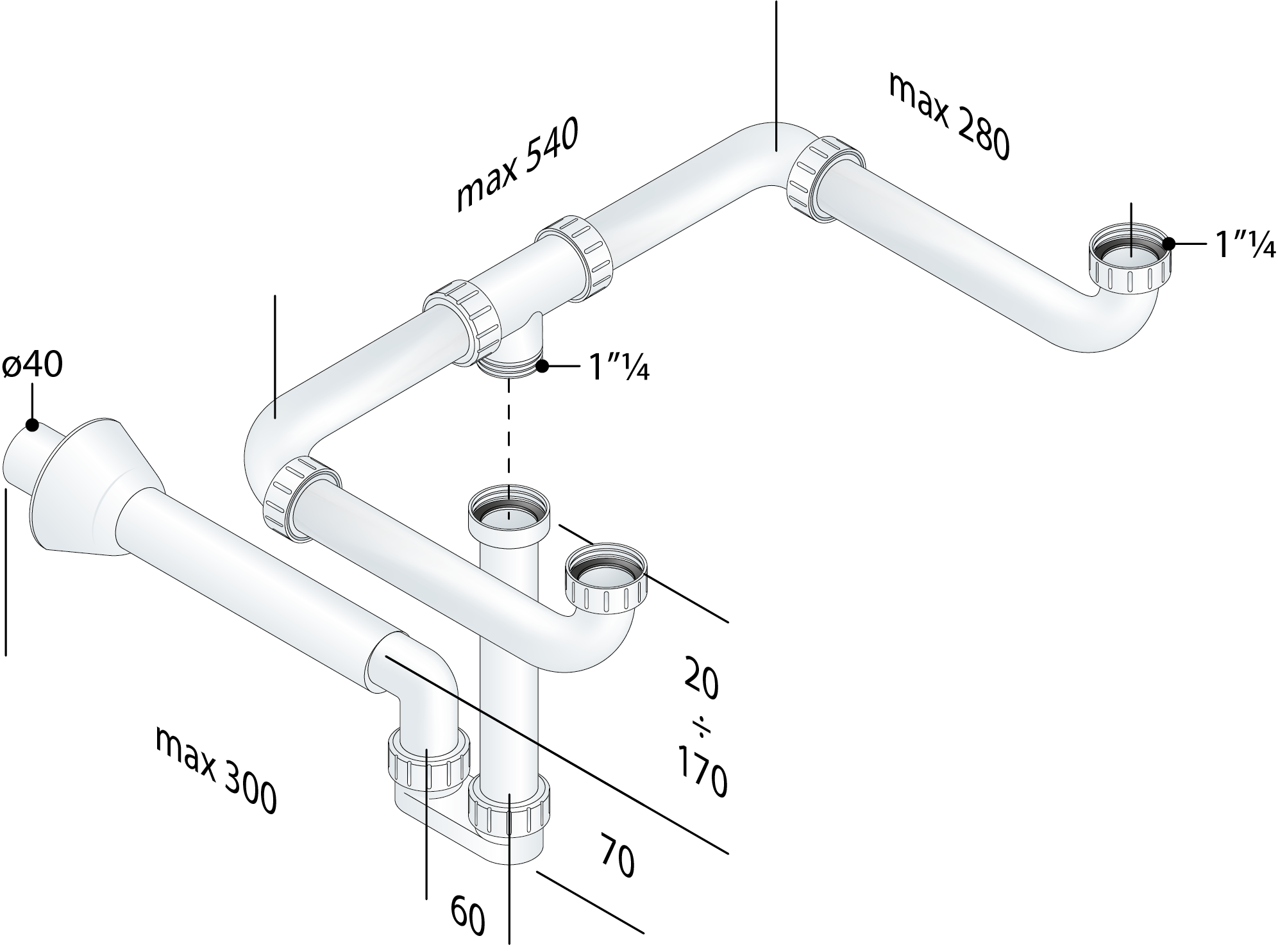 Sifon určený pro dvě umyvadla nebo dvojumyvadlo s jedním odpadem a roztečí výpustí maximálně 540 mm.