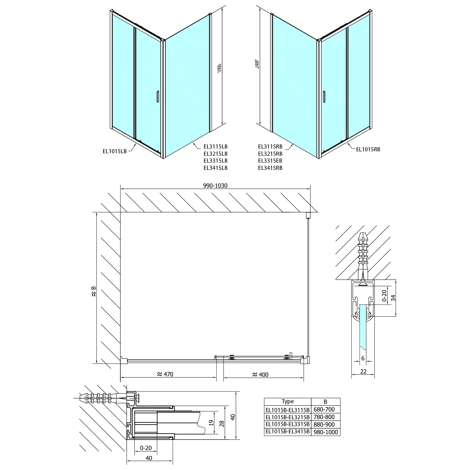 EASY BLACK boční stěna 900mm, čiré sklo EL3315B