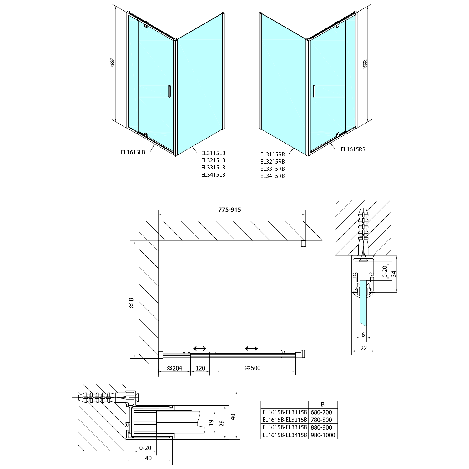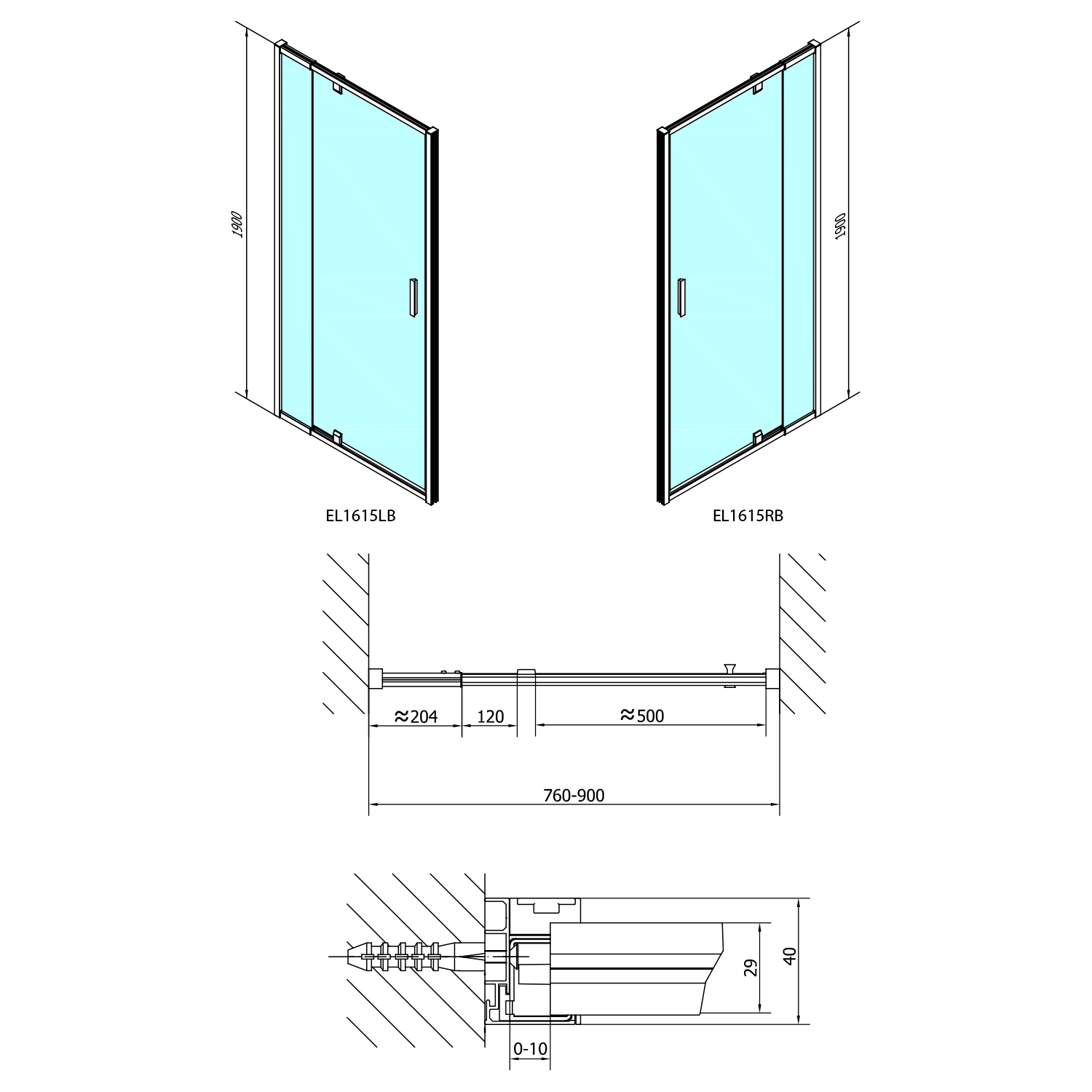 EASY BLACK boční stěna 900mm, čiré sklo EL3315B