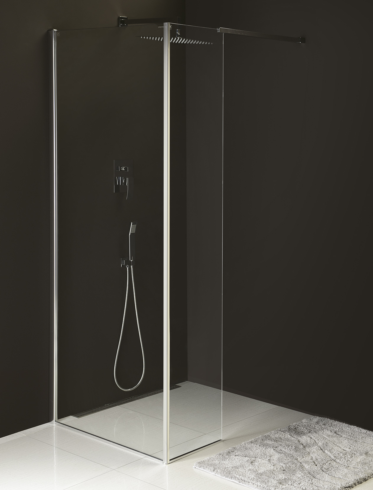 Aby vznikla dvoudílná zástěna ve tvaru "L", je potřeba k pevné stěně dokoupit přídavný pevný panel MS2B.
