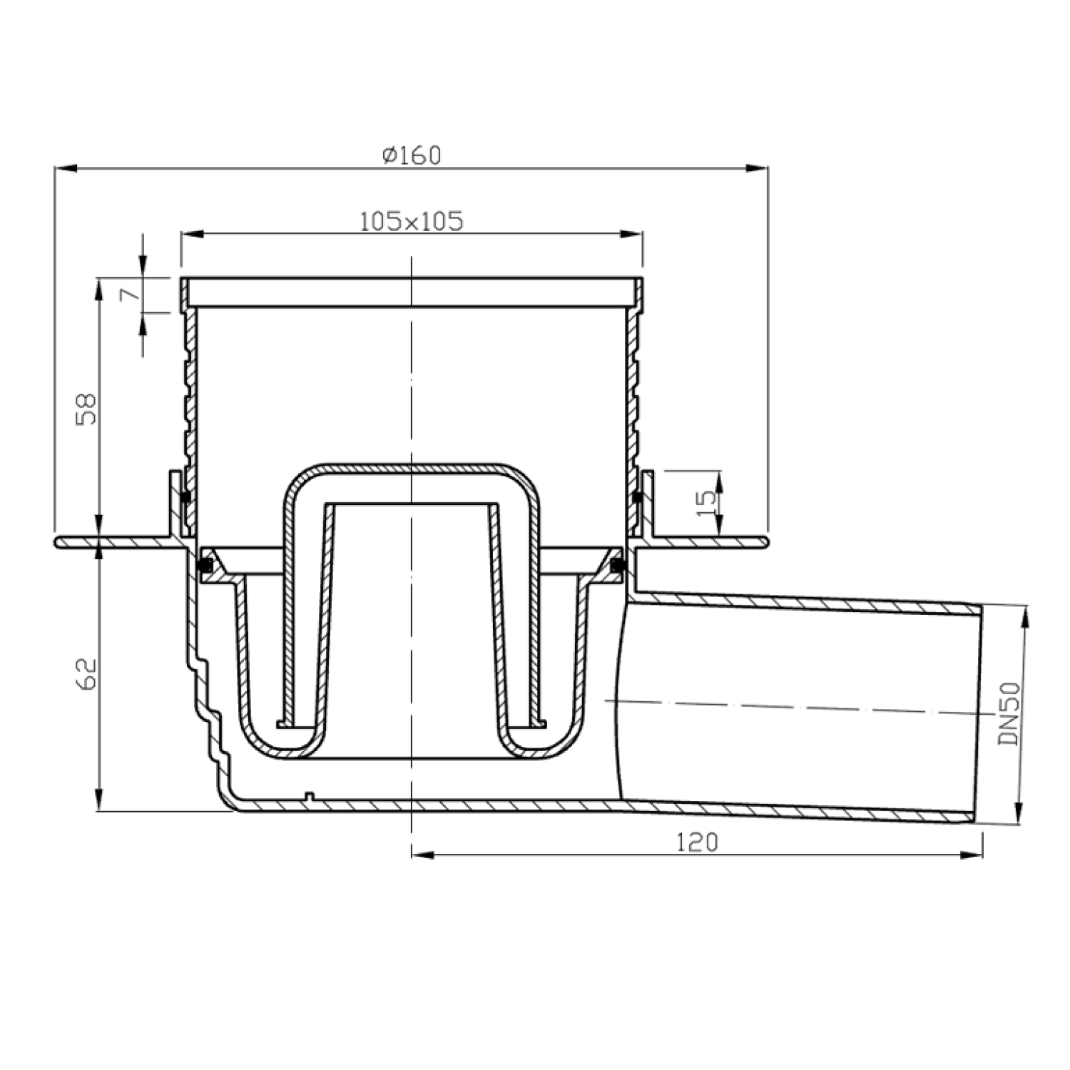 Podlahová vpust 105x105 přímá, DN50, mřížka nerez lesk 183.020.0