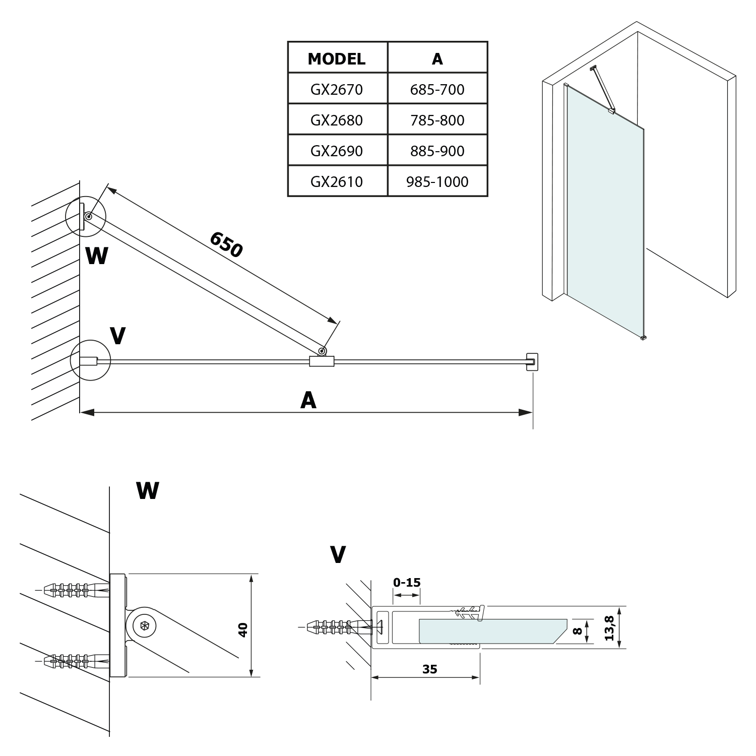 VARIO rohová vzpěra 650mm, černá GX2014