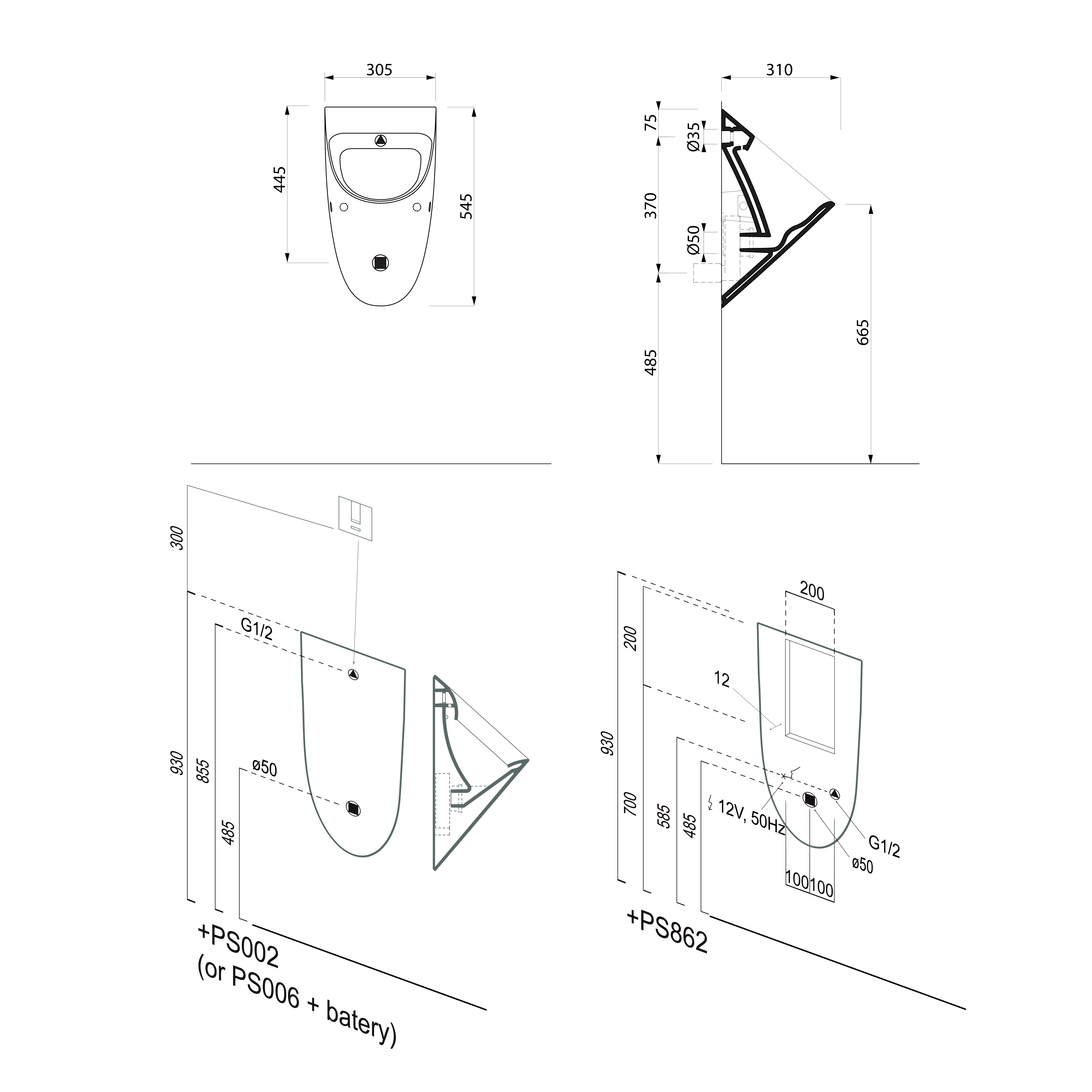 • Při instalaci s automatickým splachovačem PS002 je nutné instalovat i napájecí zdroj (PS05T nebo PS10T).