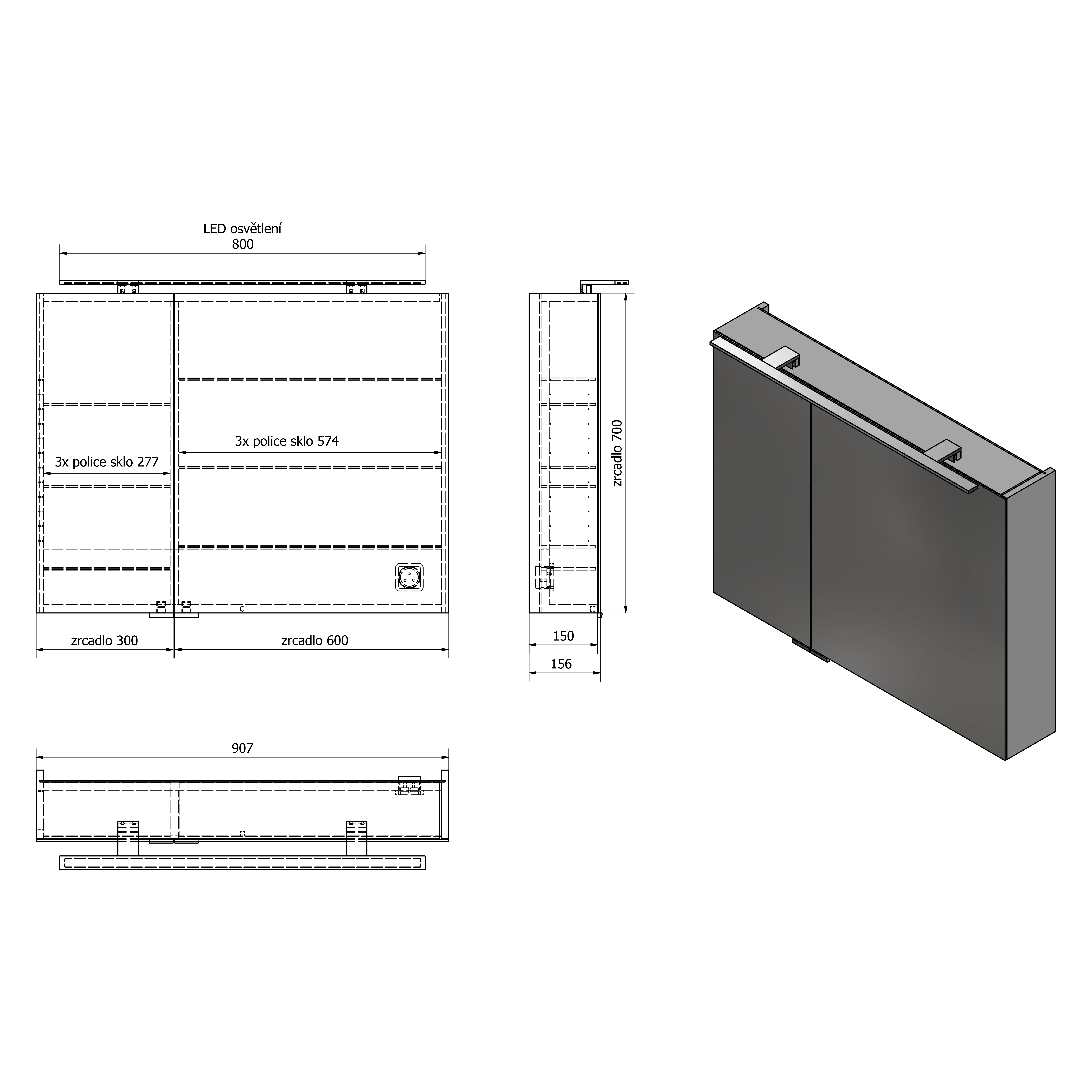 Osvětlení; Elektrická zásuvka; Oboustranná zrcadlová dvířka; Zpomalovací panty