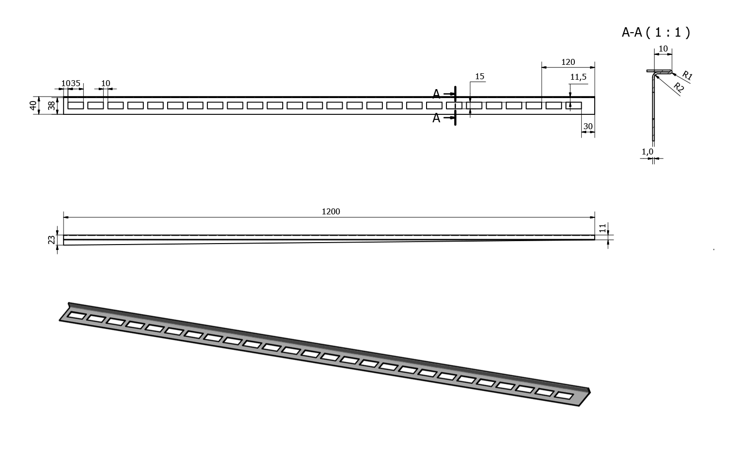 Spádová lišta, levá, výška 12mm, délka 1200mm, nerez mat SPD1212-L