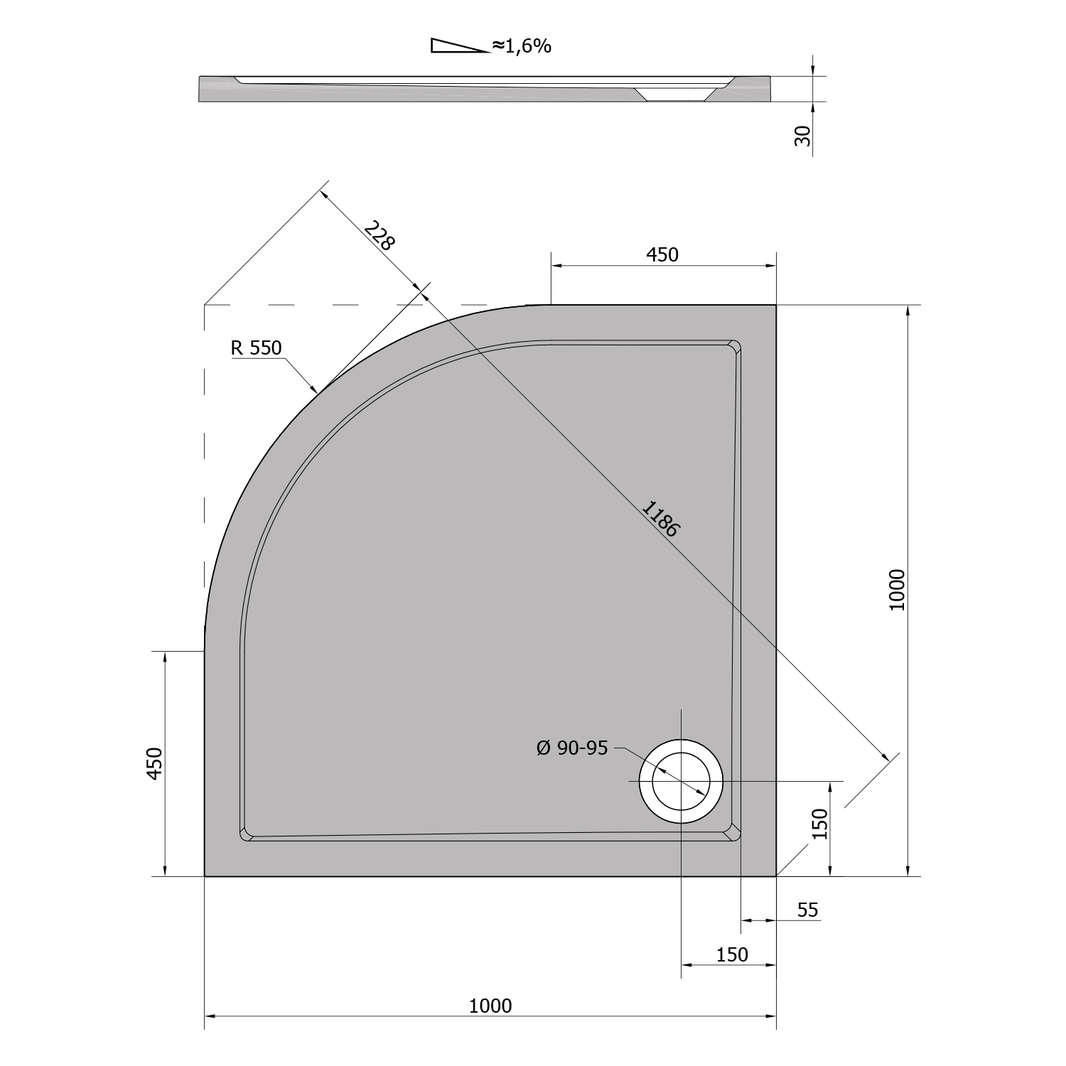ARCA sprchová vanička z litého mramoru, čtvrtkruh 100x100cm, R550, bílá PA551