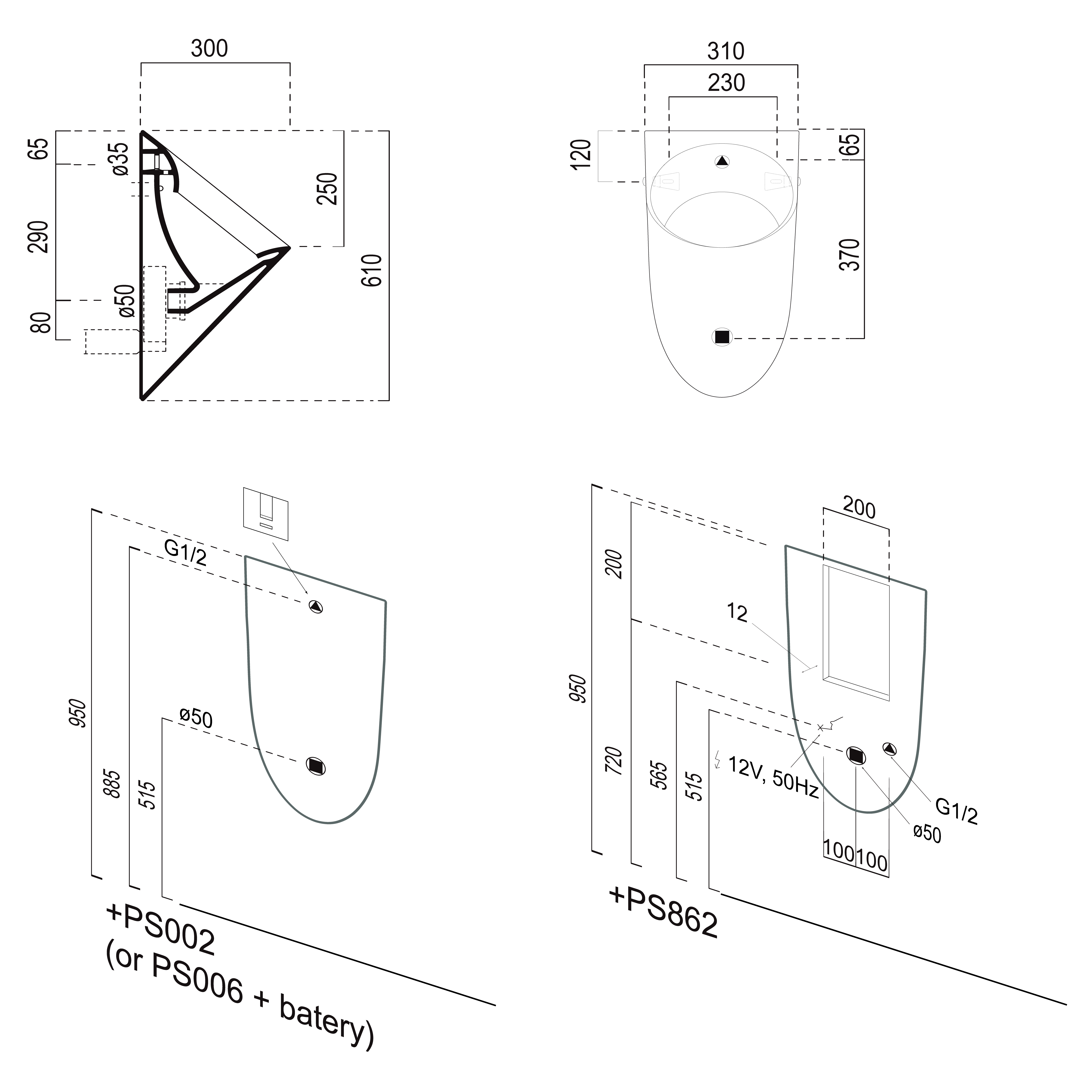 • Při instalaci s automatickým splachovačem PS002 je nutné instalovat i napájecí zdroj (PS05T nebo PS10T).