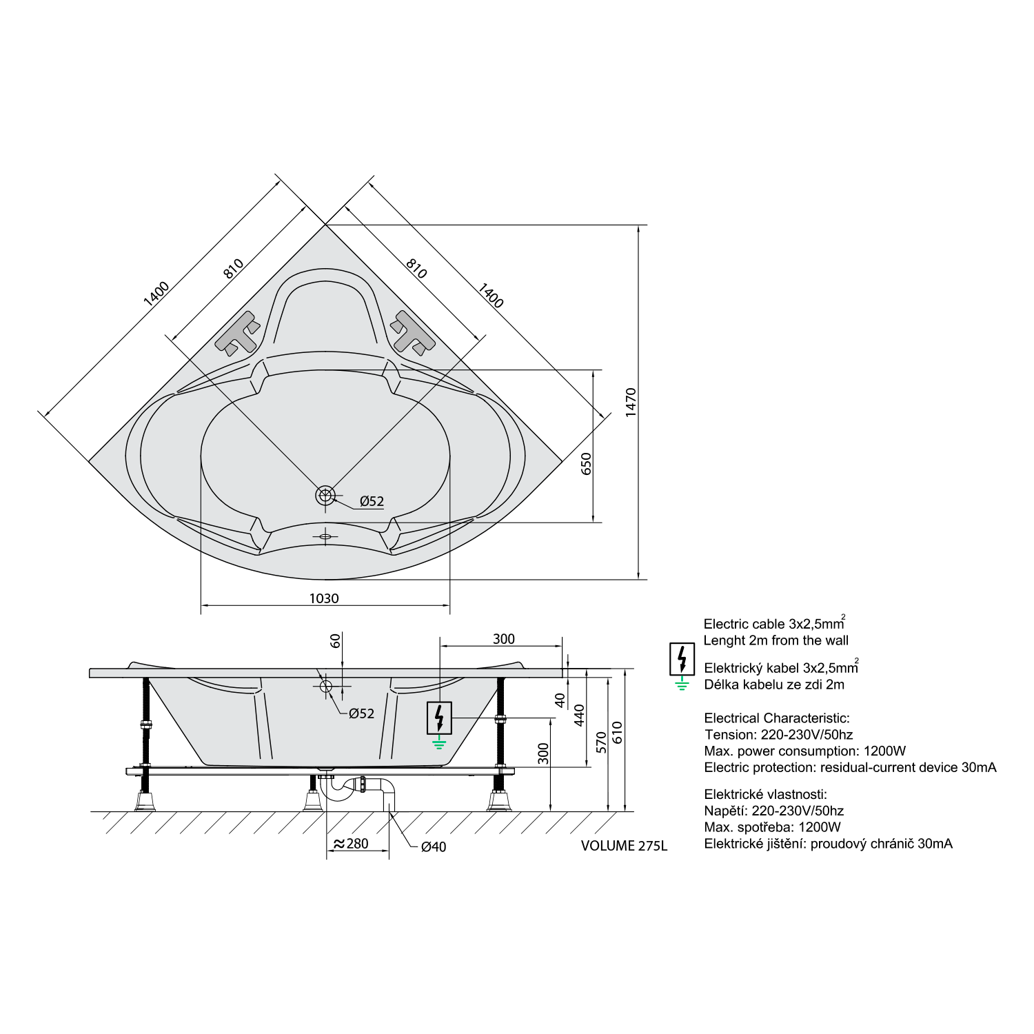 ROSANA hydromasážní vana, 140x140x49cm, Highline Hydro-Air, chrom 64119.6010