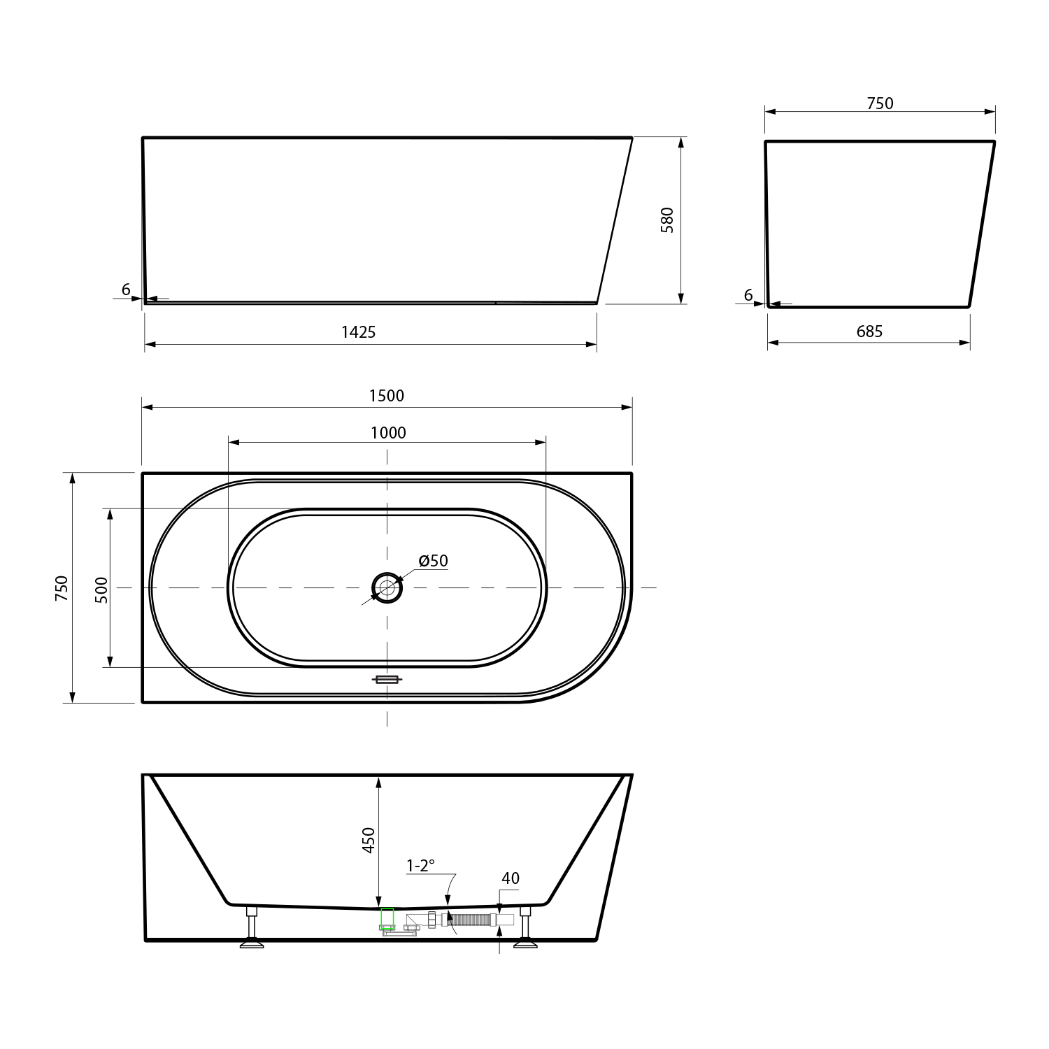 TIBERA STRIP L rohová stojící vana, 150x75cm, bílá E1047G